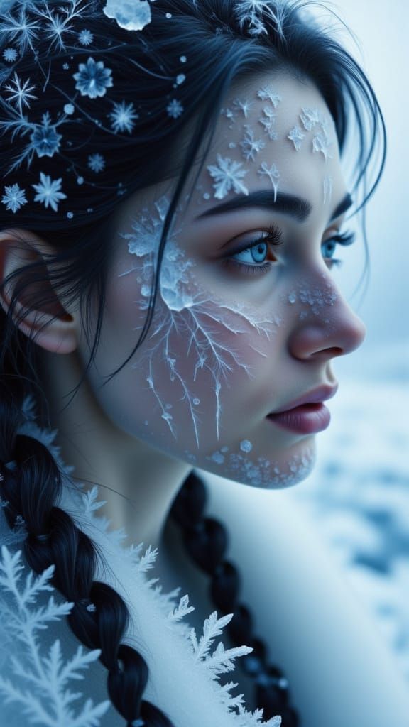 This image shows a close-up portrait of an Alaskan woman with icy skin and frost patterns. Captured in high-detail macro realism with diffused polar light, it highlights fragile beauty.