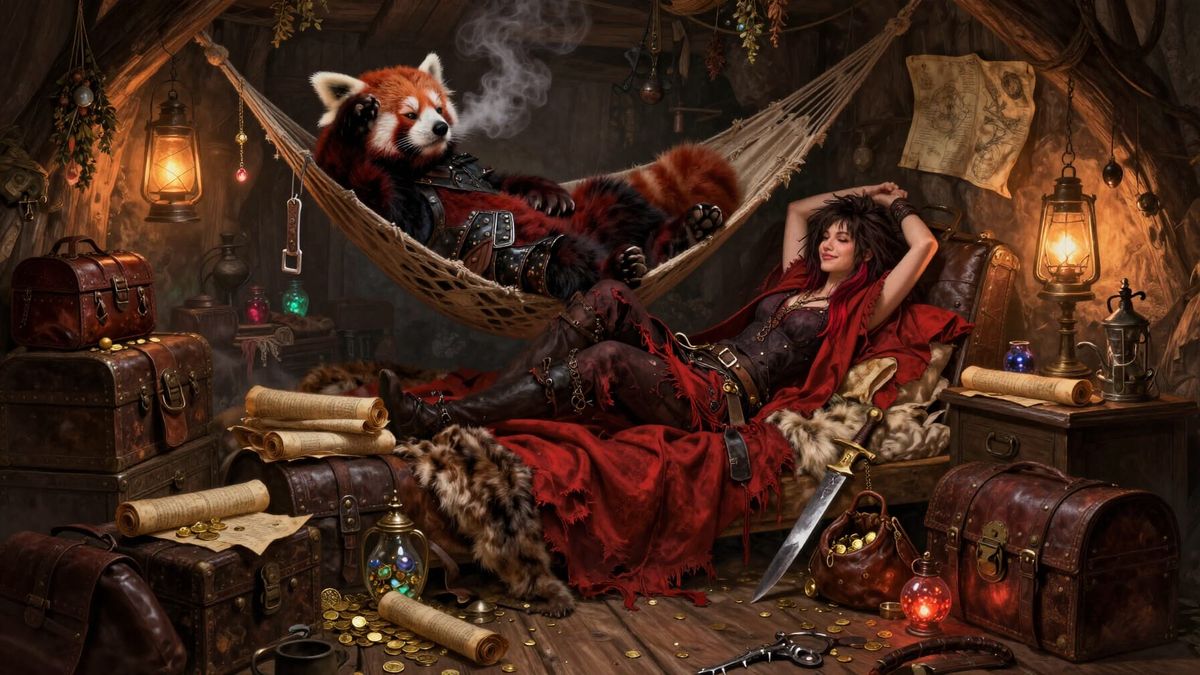 This cinematic image depicts a warm, cluttered lair filled with treasures. A giant red panda in armor rests in a hammock while a woman with a red streak in her hair relaxes in a fur-draped bed.
