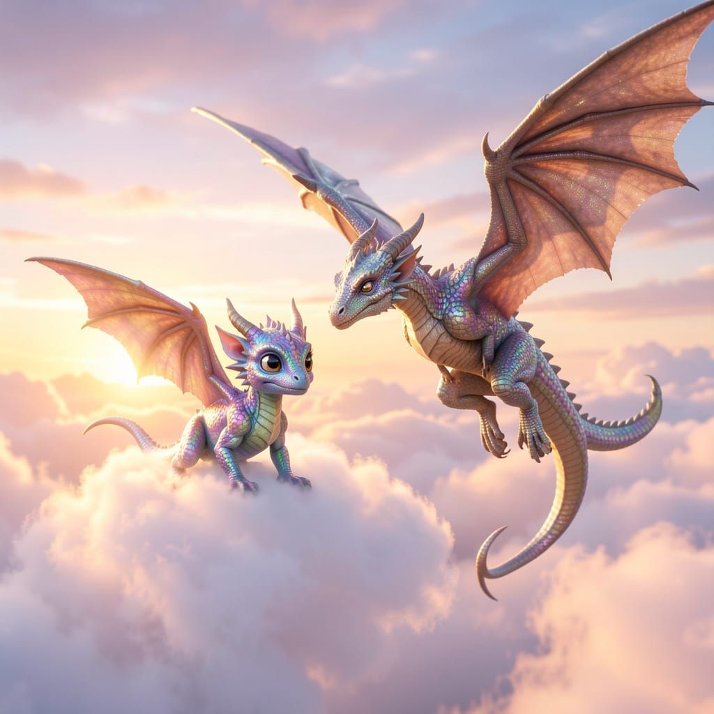 This photorealistic image shows a tiny iridescent baby dragon on a cloud next to its majestic mother. The scene is illuminated by a warm sunrise glow with soft pastel colors, captured cinematically.