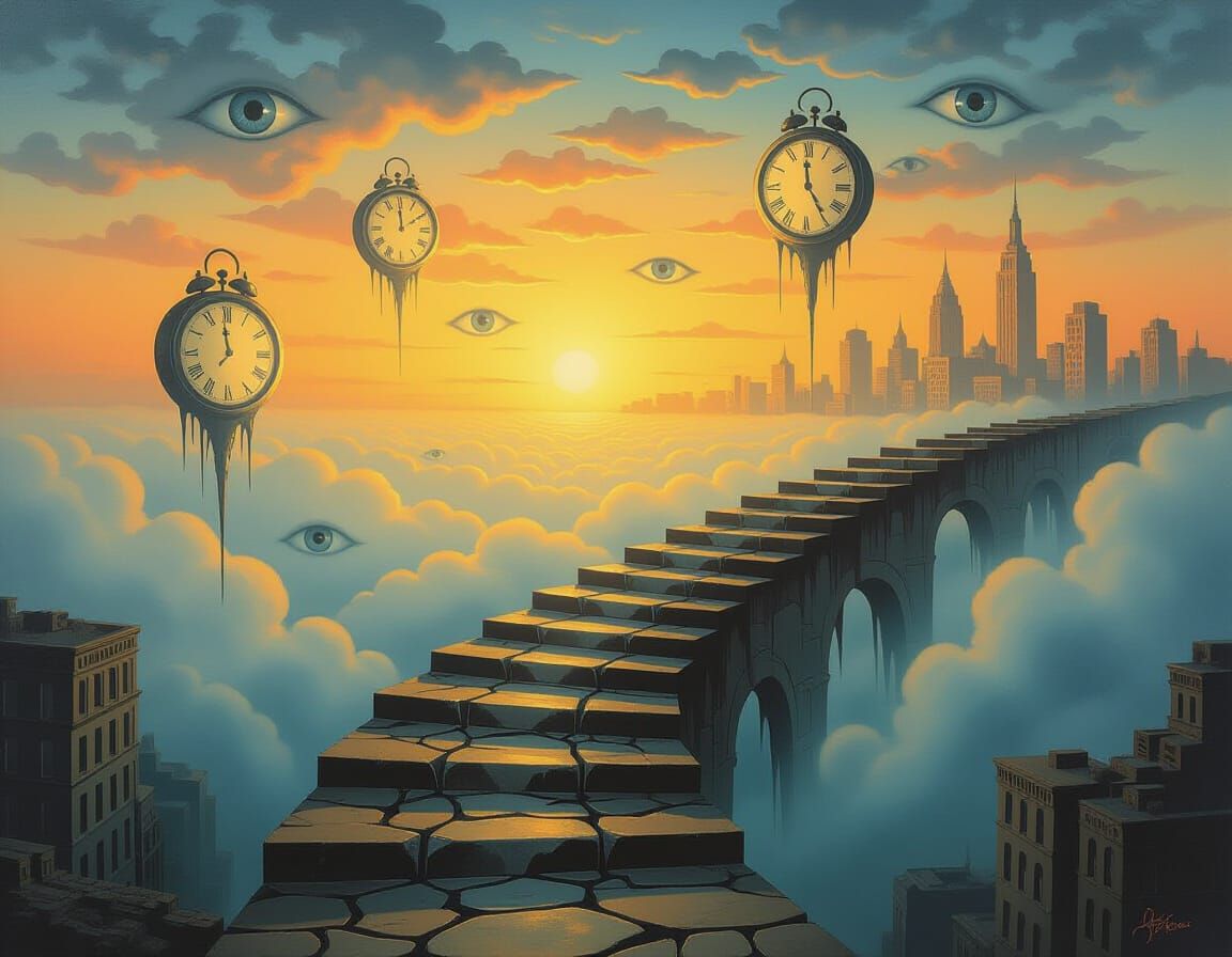 This image depicts a surreal dreamscape with melting clocks and disembodied eyes forming staircases. Fading sunset light casts distorted shadows over a blend of dreamlike and realistic city elements, rendered in a surrealist oil painting style.