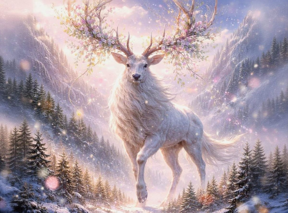 This image shows a colossal, ethereal white stag with flowers and leaves on its antlers, walking through a tiny forest with snowy mountains. Pearly light and rainbow shimmers create a magical atmosphere.