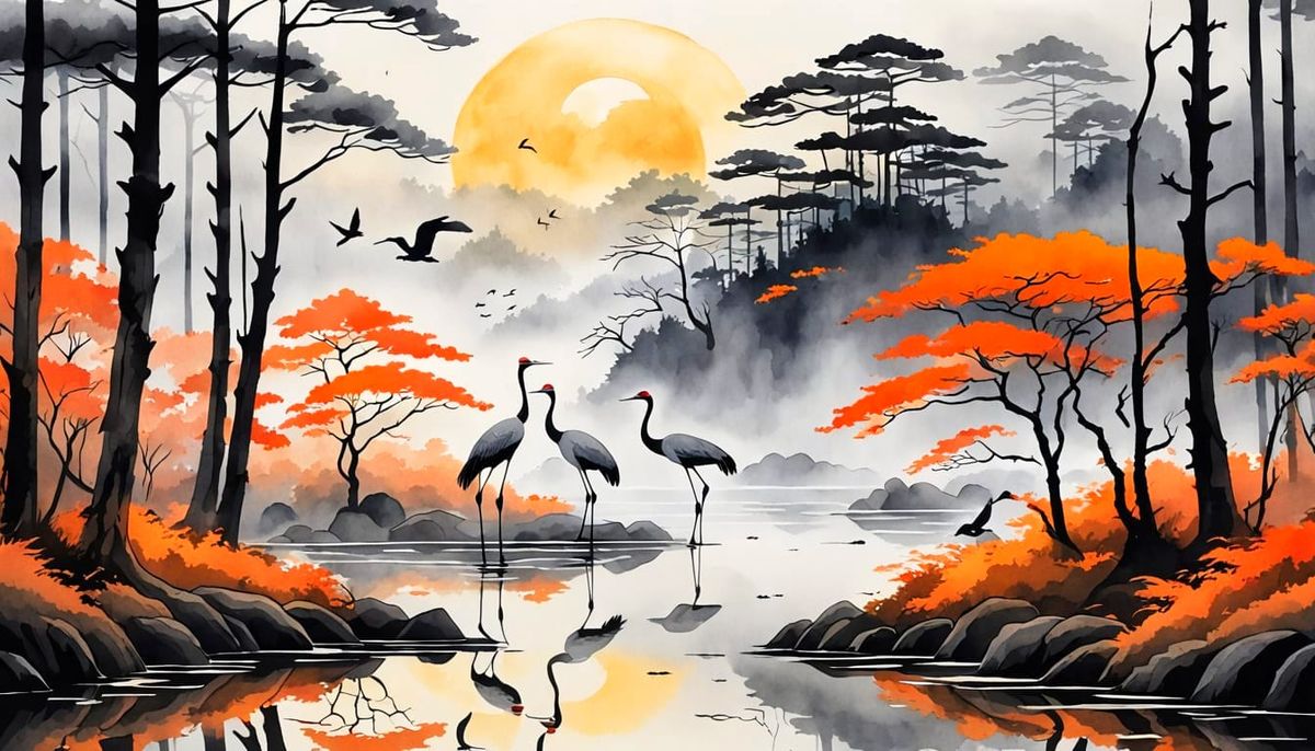 This image shows black silhouette cranes in a shallow pond within a foggy, colorful Japanese forest during fall. Rendered as a watercolor on papyrus, it features a dream-like, ethereal quality with complementary colors.