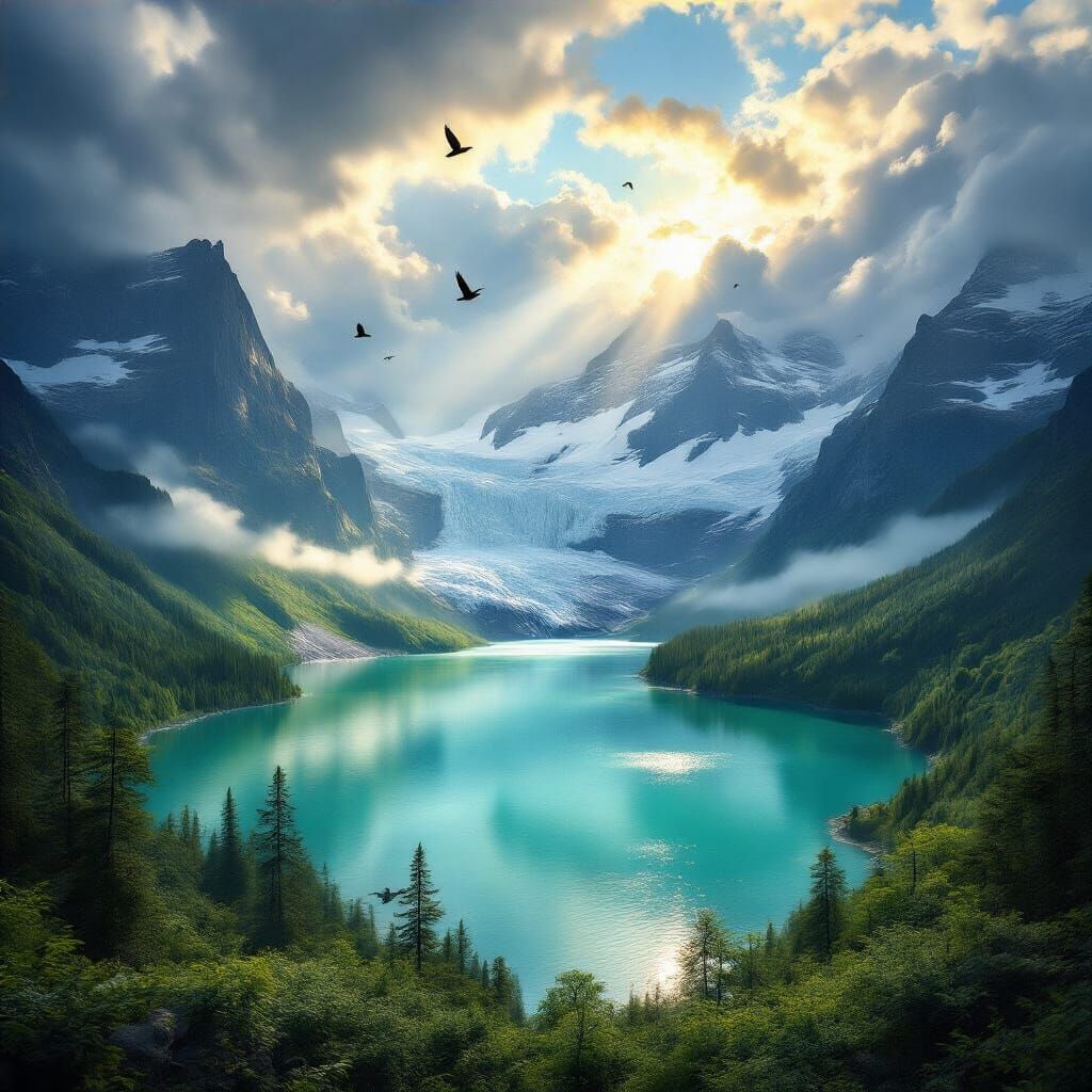 This image shows a vast, untouched wilderness with immense glacier mountains above a lush forest and a turquoise lake. Golden light breaks through storm clouds, illuminating waterfalls and mist, in a photorealistic, cinematic style.