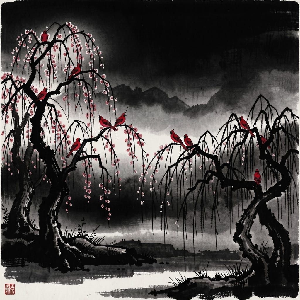 This image shows a minimalist ink wash painting of willow trees with vibrant red cardinals. It features atmospheric lighting and a stark contrast, reminiscent of traditional East Asian art.