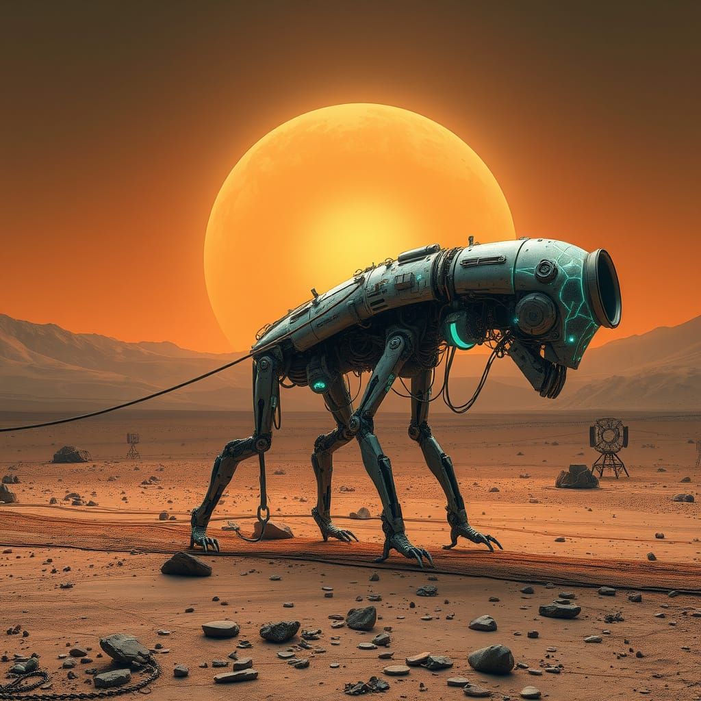 A mesmerizing, biomechanical creature fuses organic and electronic elements, shattering tranquility with its presence, in a display of cybernetic and quantum fluctuations, echoing futuristic visions and abstract expressionism.