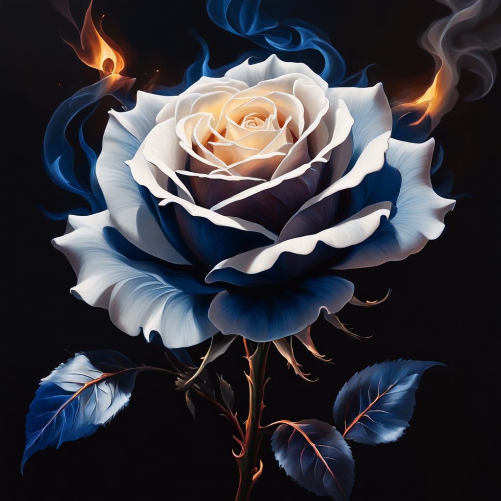 This oil painting features a white rose with vibrant, glowing blue petals on dark glass, surrounded by smoke and embers. Dramatic lighting and sharp details create a unique, dark aesthetic.