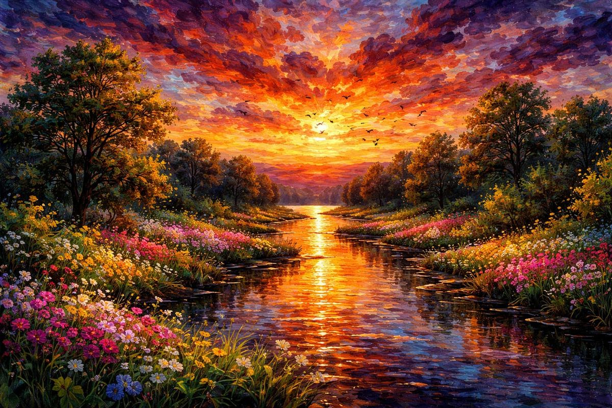 A glowing sky spills its colors into the quiet river, where wildflowers lean toward the fading sun. Birds drift across the burning clouds, and the world holds its breath in a moment shaped by light and calm.