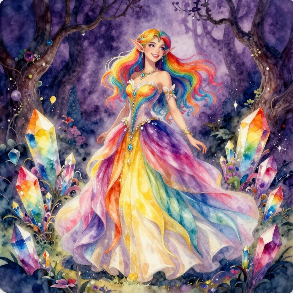 This image shows a beautiful elf in a rainbow ball gown, standing in a magical garden with glowing crystals. The artwork features dynamic lighting and deep colors, evoking dark fantasy concept art.