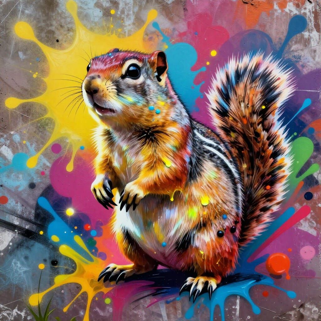 This image showcases a Ukrainian ground squirrel rendered in a striking graffiti art style. It features bold spray paint textures with a high contrast, colorful palette and glowing accents.