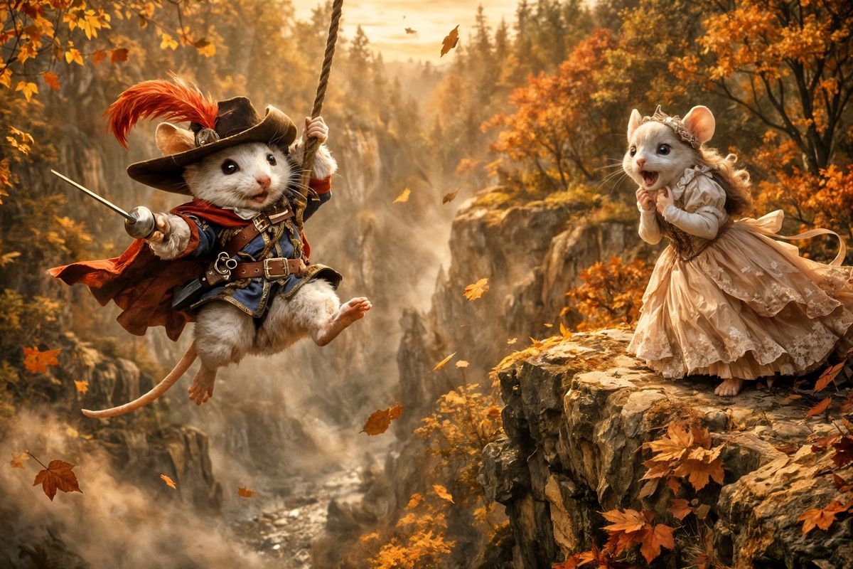 A brave mouse in musketeer attire swings across a misty autumn canyon, bathed in golden hour light. Another mouse watches from the edge in this ultra-realistic, storybook fantasy scene.