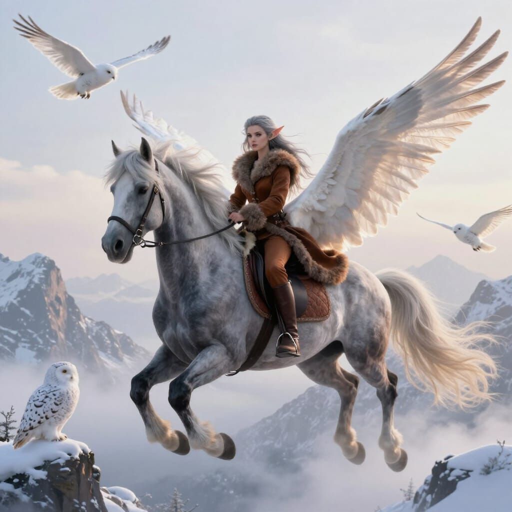 This image shows a seductive elf with gray hair and black eyes riding a dark gray pegasus with feathered wings. They fly above snowy mountains, with owls nearby, in a hyperdetailed, luminous fantasy style.