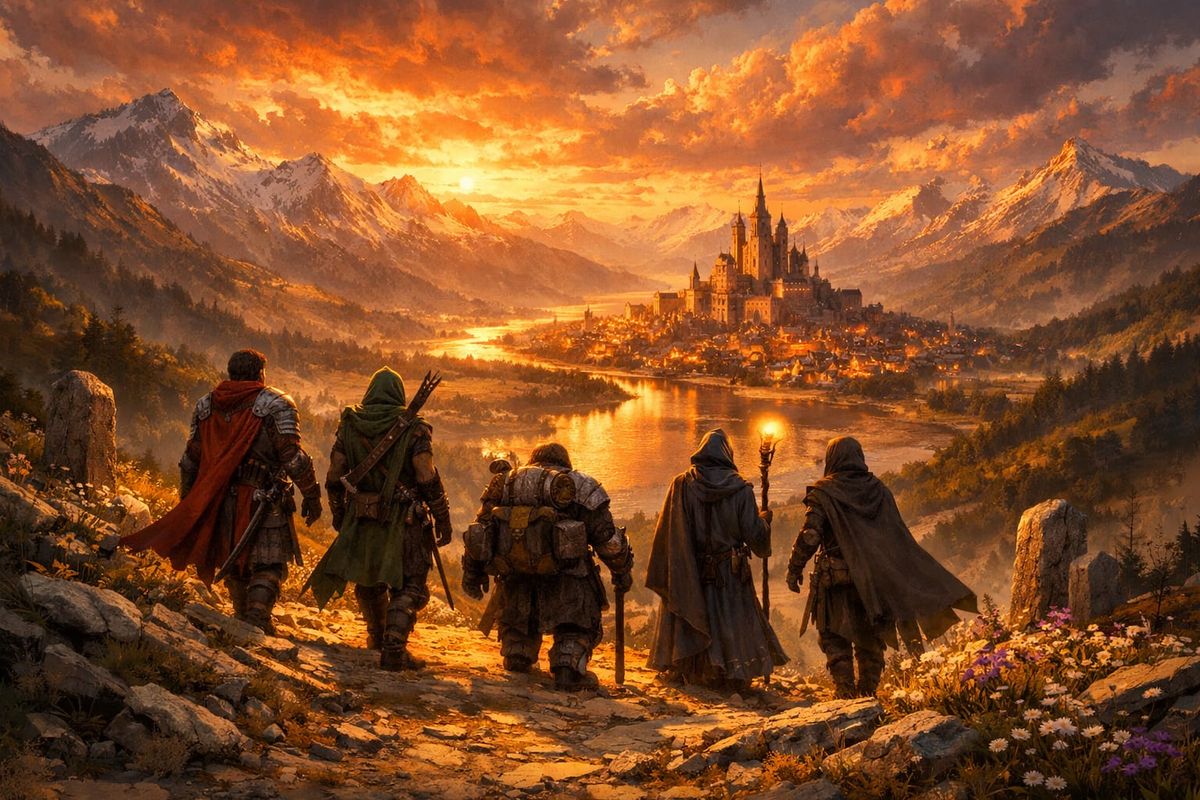 This digital painting shows diverse fantasy adventurers returning to a medieval town after a long journey. The scene features a dramatic sunset, golden hour lighting, and a triumphant atmosphere.