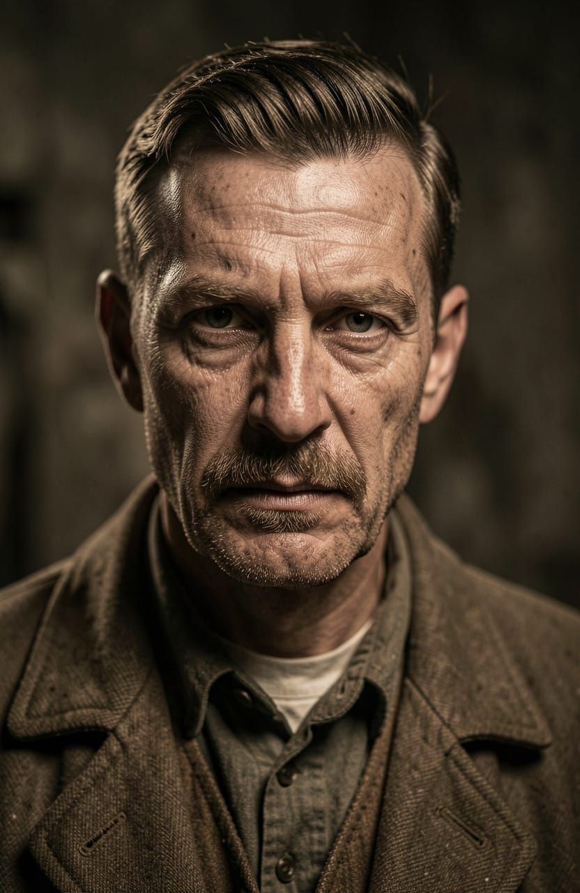 This photorealistic image captures a close-up portrait of a 1920s Irish American man, characterized by dramatic shadows and highlights. Shot with a shallow depth of field for a striking effect.