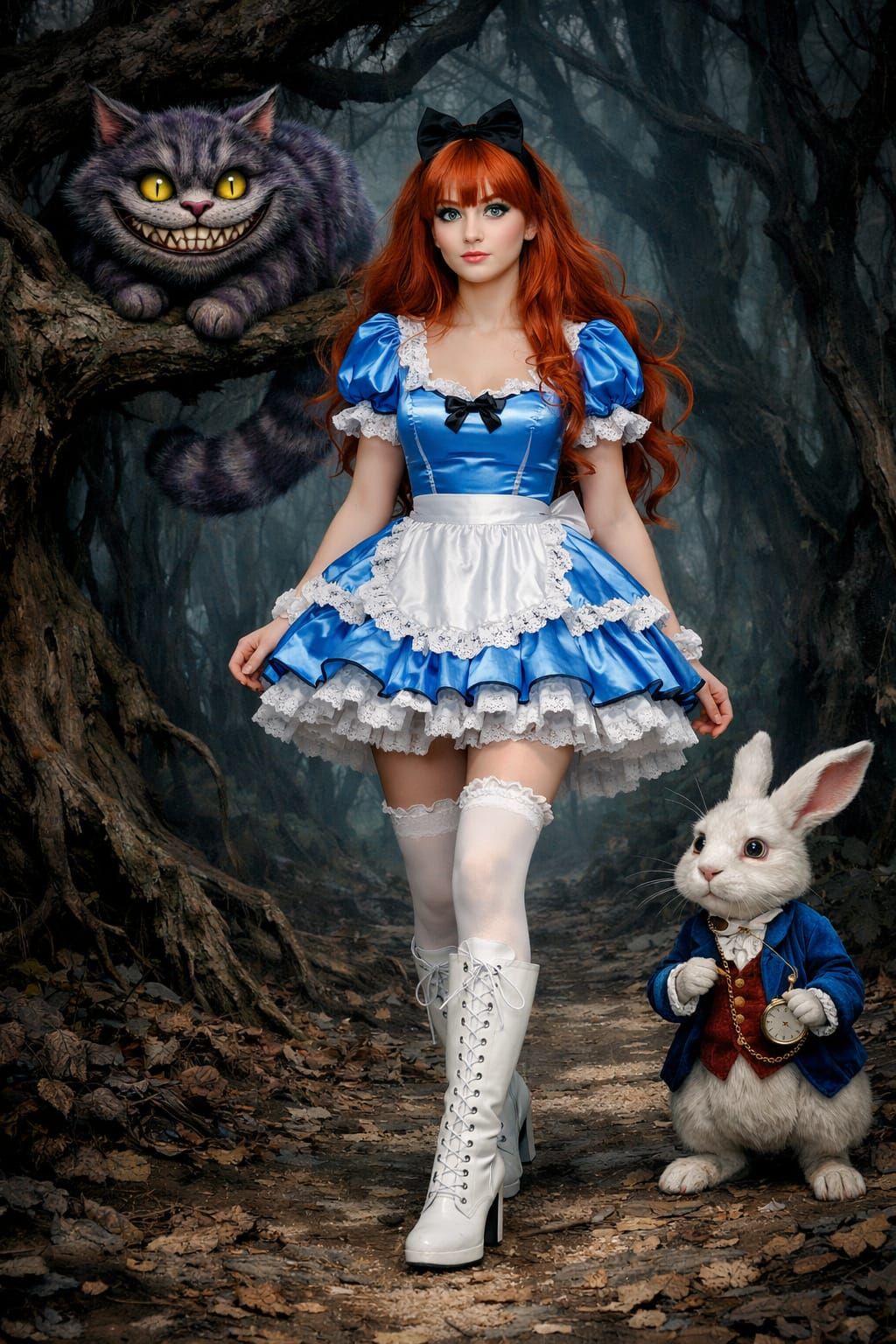 A beautiful woman in an Alice in Wonderland dress walks a dark forest path with a grinning Cheshire Cat and a worried White Rabbit. Realistic digital art.