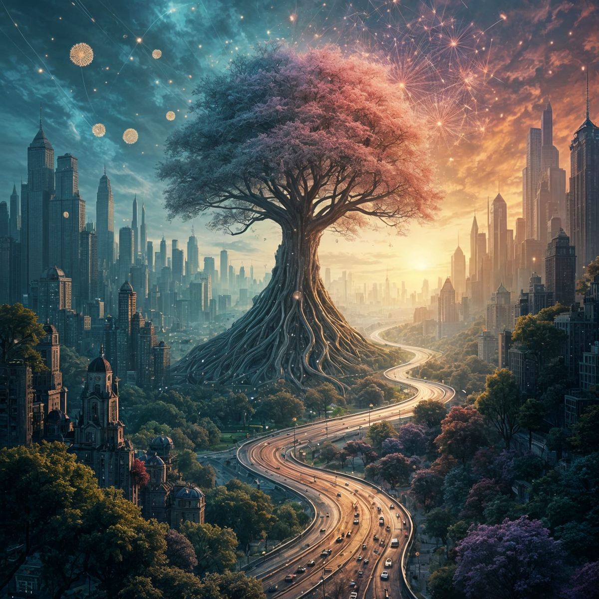 This image depicts a surreal cityscape with looping roads and floating dandelion seeds within a giant Yggdrasil tree silhouette. It features impossible geometries and a vibrant, textured style.