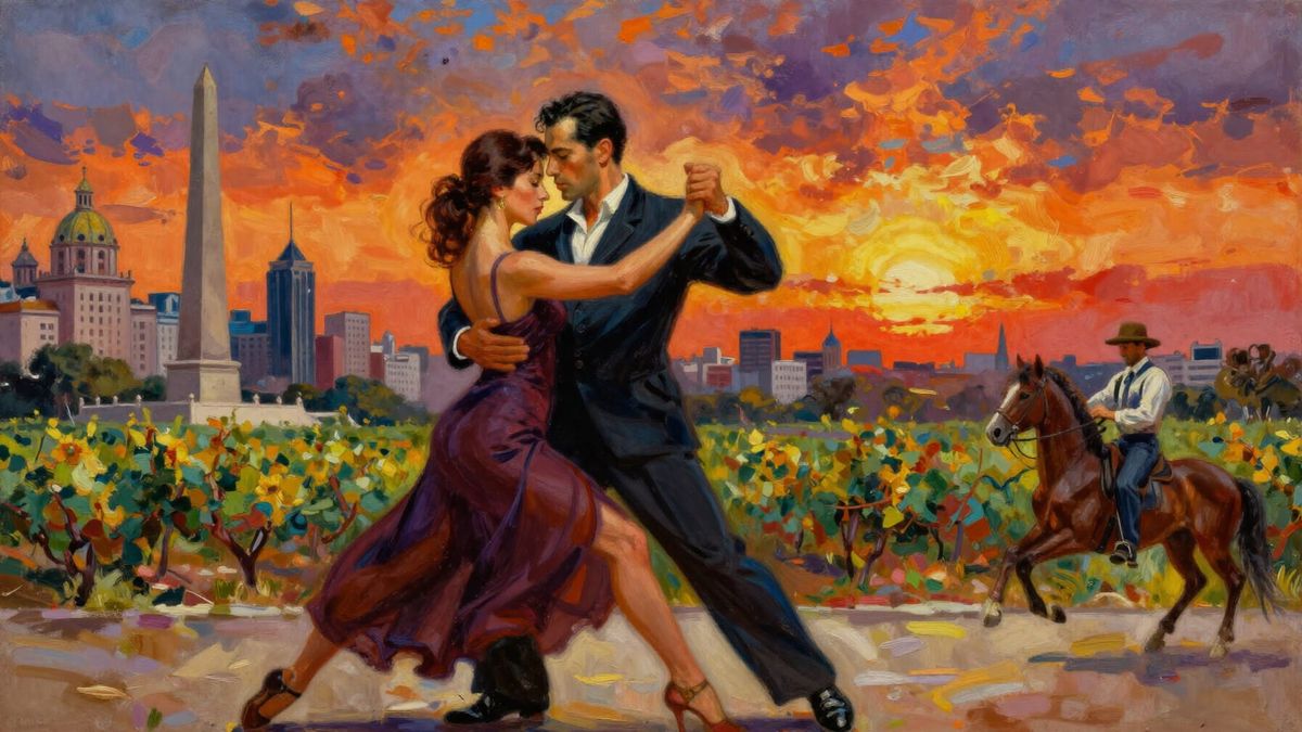 This image captures a passionate Argentine couple dancing the Tango, set against the Buenos Aires skyline and Pampas landscape. Painted in a bold, emotive impasto oil style with dramatic lighting.