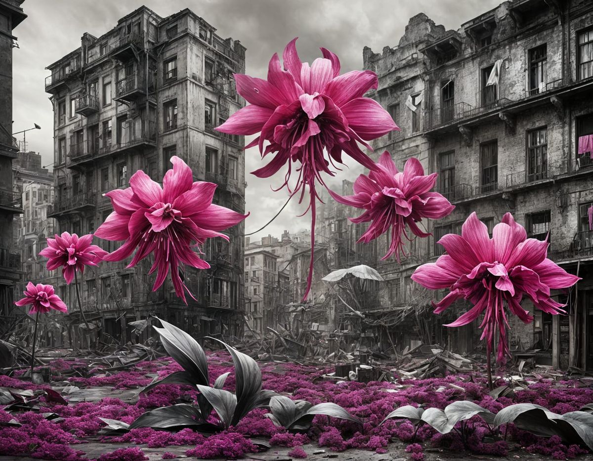 This abstract surrealist image depicts an abandoned cityscape overgrown with giant flowers, rendered in a maximalist, silver nitrate photographic style.