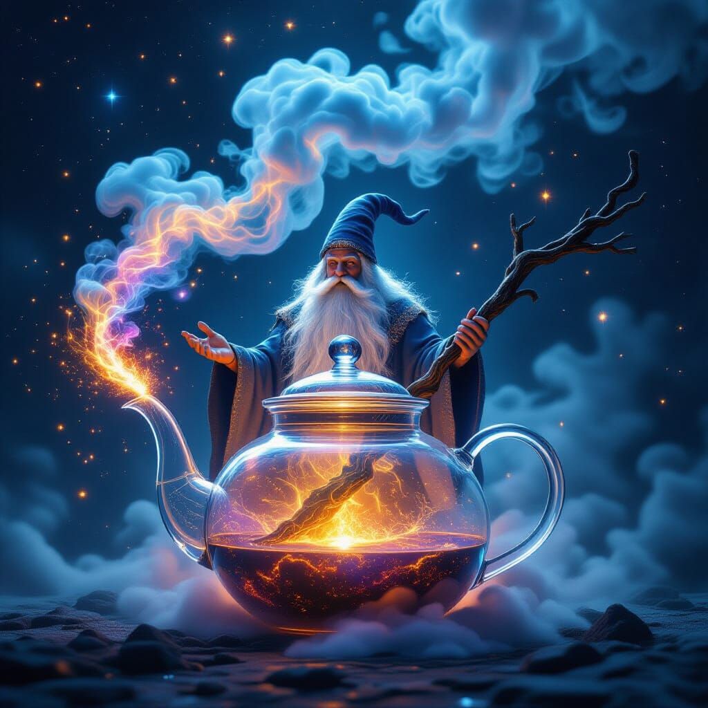 An old magical spirit holds a magic wand in his hand from which sparkles, he is located in a very large magical transparent teapot from which thick gray smoke is billowing, stars are shining around the teapot . intricate details, HDR, beautifully shot, hyperrealistic, sharp focus, 64 megapixels, perfect ...