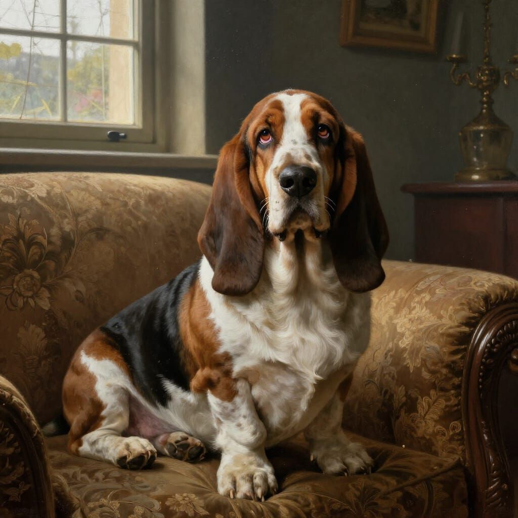 This image shows a regal Basset Hound resting on a couch in an old house, bathed in sunlight. Rendered with intricate detail and rich, earthy tones, reminiscent of Dutch Golden Age oil paintings.