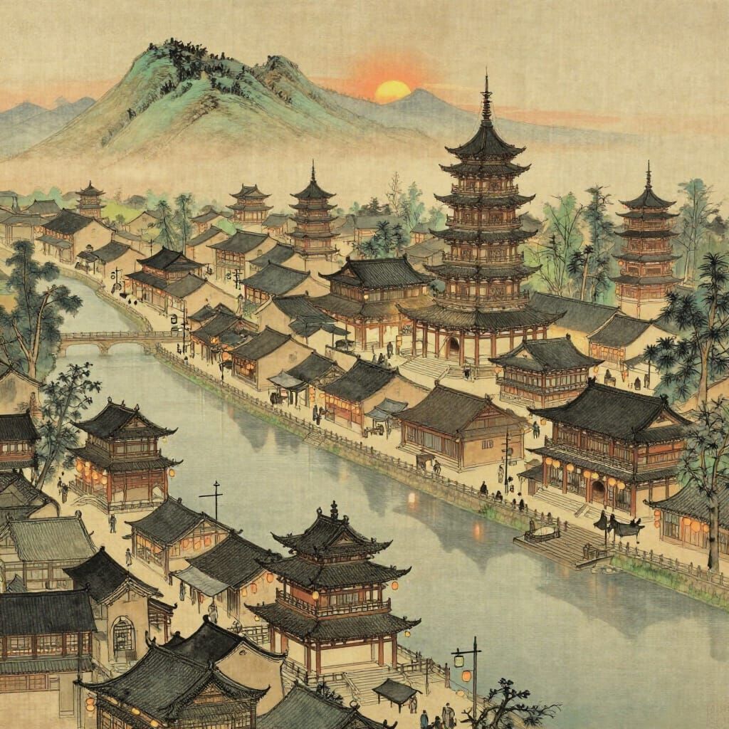 This image depicts a serene ancient Chinese city with pagodas and rivers, painted in a traditional ink wash style reminiscent of classical Chinese art.