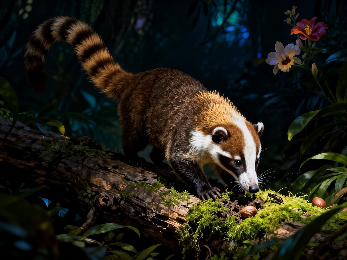 This detailed digital painting shows a white-nosed coati with a long, ringed tail sniffing and digging for insects on a mossy log in a dark jungle. Features vivid colors and dramatic lighting.