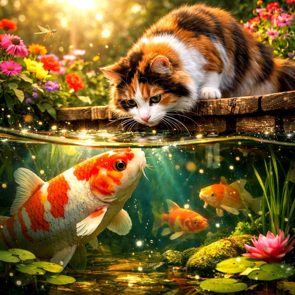 This vivid digital artwork shows a split view of a pond, with a calico cat on a deck above and a koi fish below. Magical sparkles and clear water enhance the scene.