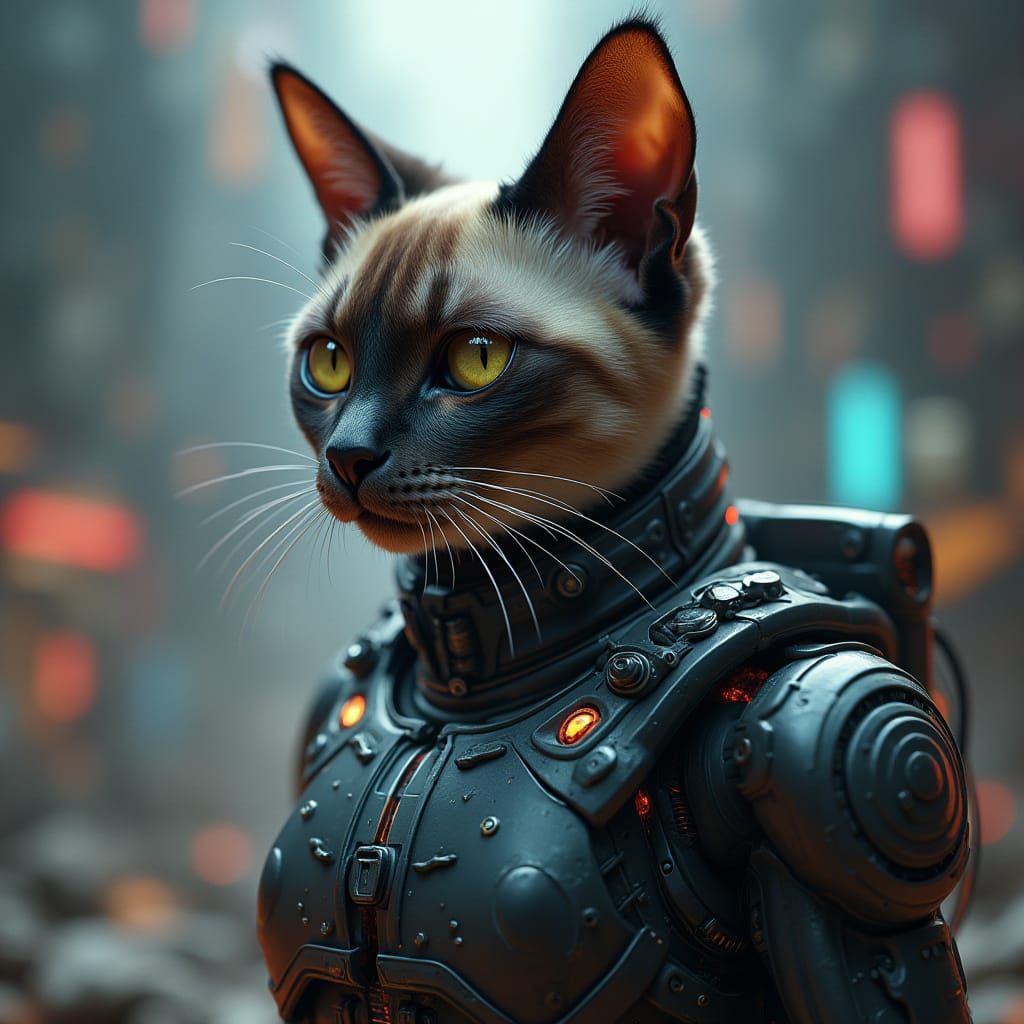 A striking image of a Siamese cat encased in a high-tech exoskeleton, surrounded by sleek metallic details and neon lights, set against a dramatic cinematic background, rendered in photorealistic detail with a futuristic aesthetic inspired by Syd Mead and Ash Thorp
