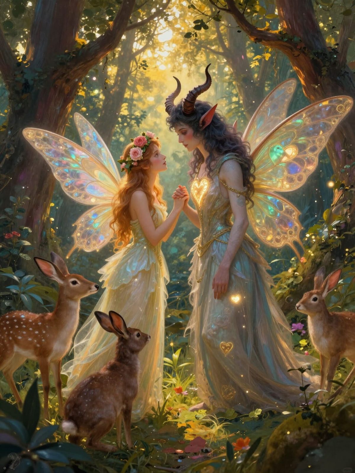 Photo-realistic. Fantastic fantasy. Let's view something novel. Heart warming, beautiful, exciting, colorful. Examine trending for the near future & present likely scene that most people will like. Key words: Love demon meets Love fairy & lush forest & infatuated forest animals. Use meticulous attention ...