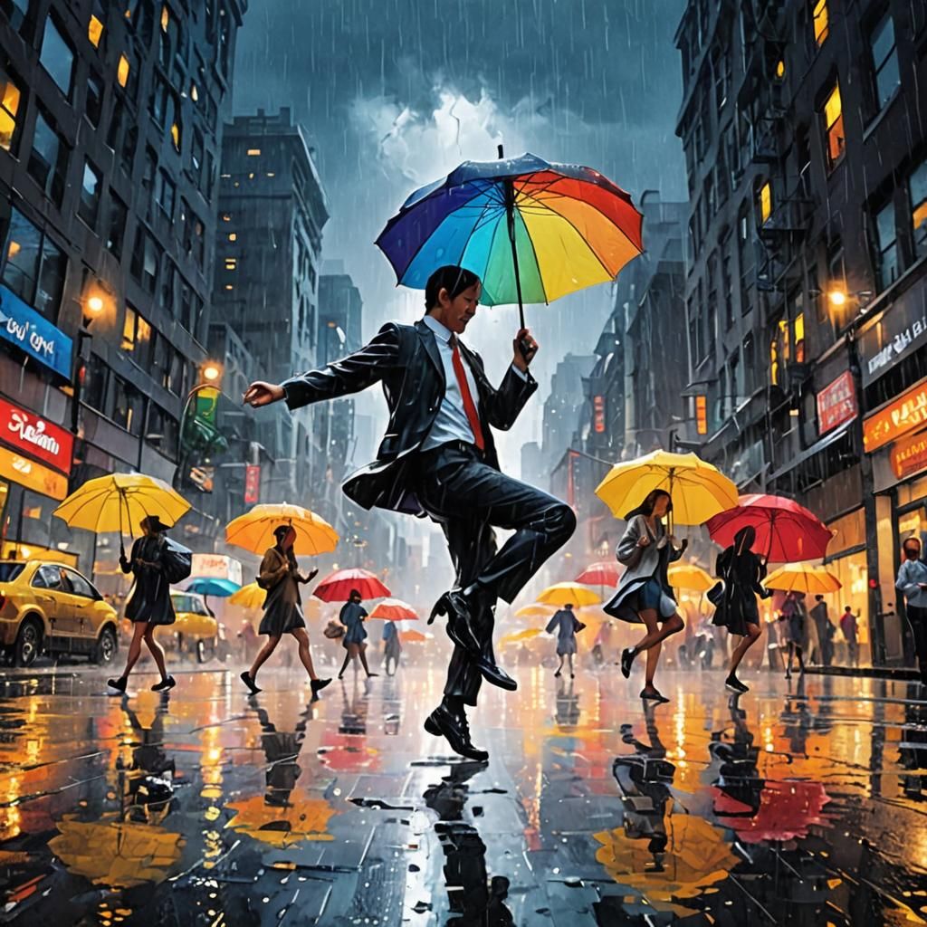 Rain keeps falling all around, Splashing feet on soggy ground. Puddles form a rhythmic beat Dancing in the city's heat. Bright umbrellas open wide Coloring the gray with pride. Laughing faces glowing bright Underneath the stormy light. We're dancing in the rain tonight, Spinning under cloudy skies Feel the joy take over pain, Let the rhythm cleanse our minds