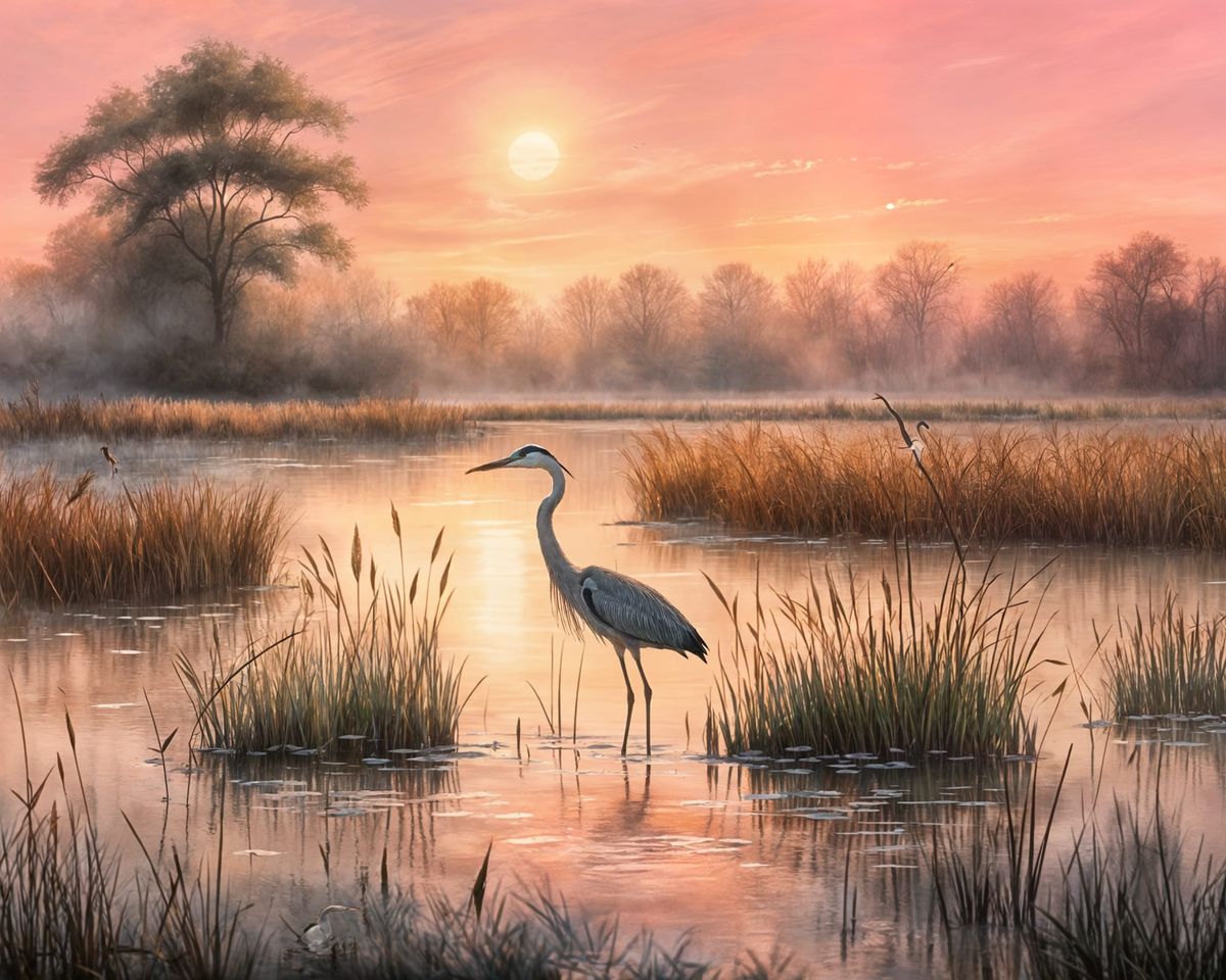 This image shows a peaceful wetland at dawn, featuring a heron, mist, and pastel sunrise colors. Rendered in a whimsical illustration style, it captures the tranquil beauty of the ecosystem.