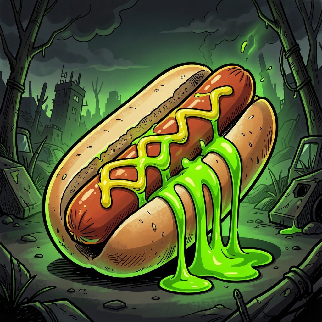 A cartoon-style hot dog oozes glowing green poison in a dark, toxic wasteland. Dramatic lighting and bold outlines create a sense of unease and dark humor.