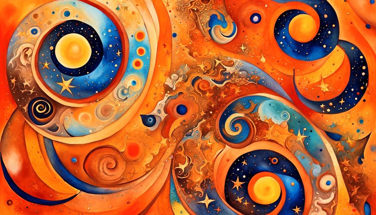 Close up portrait of three large spiral 3D vortex maelstroms overlapping with giant stars whirling like pinwheels , their golden sparkle arms hanging on to each other in a cosmic dance of stars, on a vivid orange background.