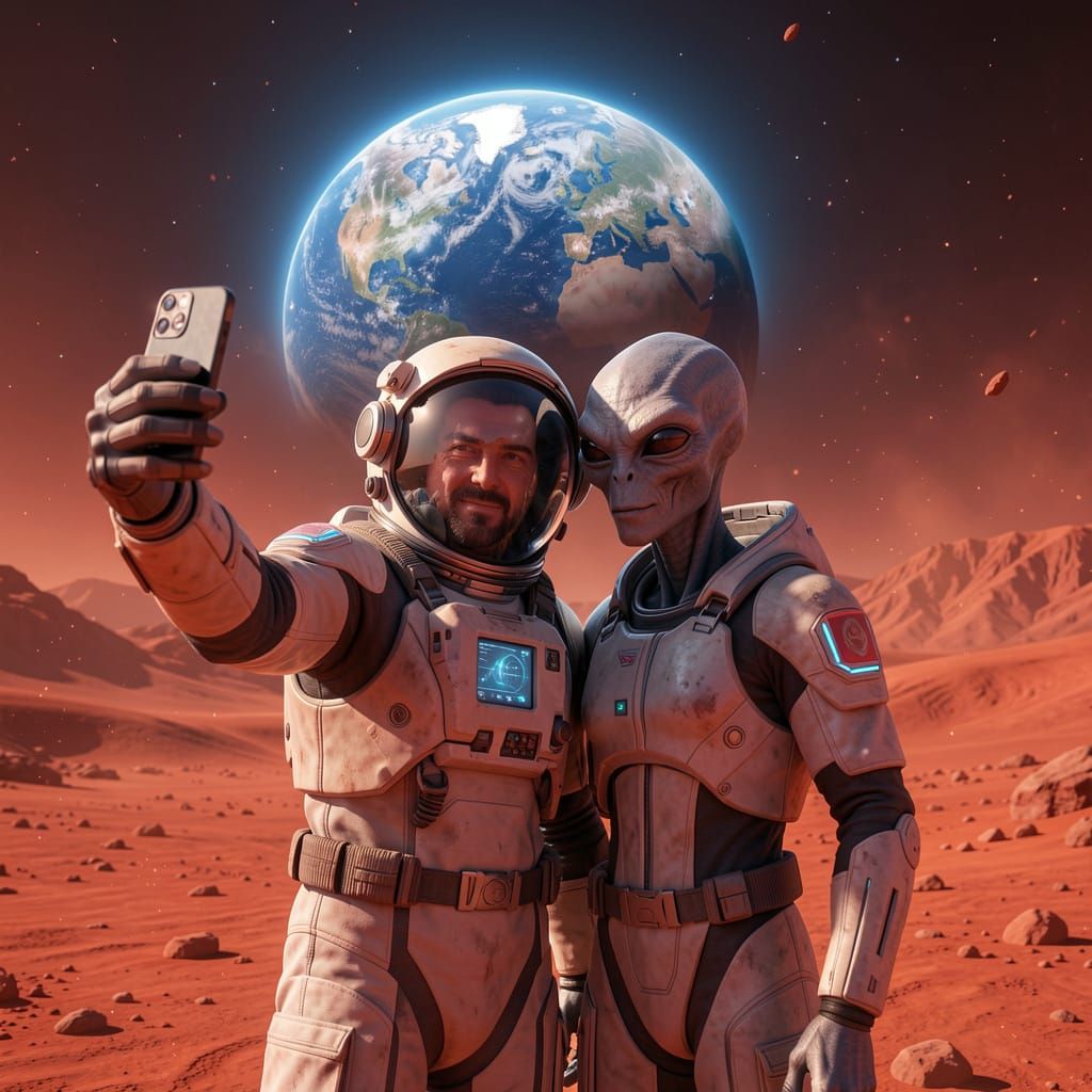 This image shows an astronaut and a gray alien posing for a selfie on the Martian surface. Earth is visible in the sky, rendered in ultra-realistic 3D with vibrant colors and cinematic detail.