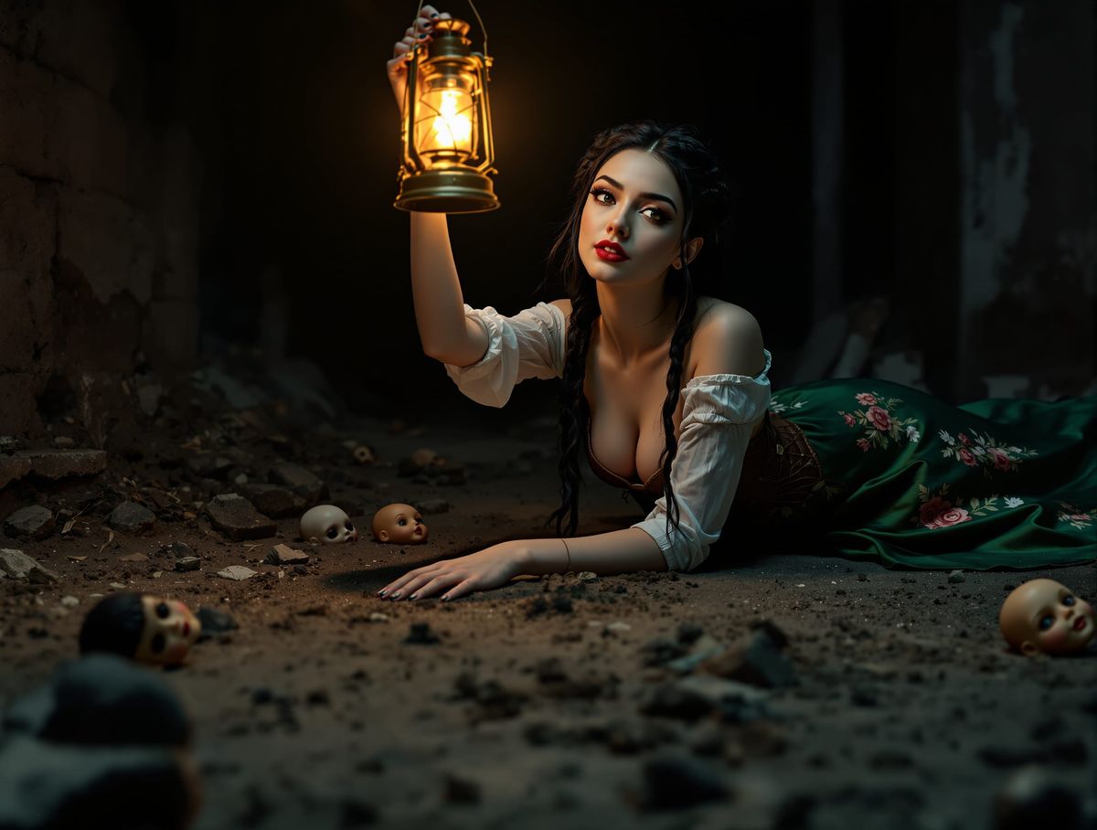 This image shows a young woman kneeling, holding a lantern aloft. The dramatic orange glow illuminates her features and attire, creating a hyper-realistic, immersive scene with a strong chiaroscuro effect.