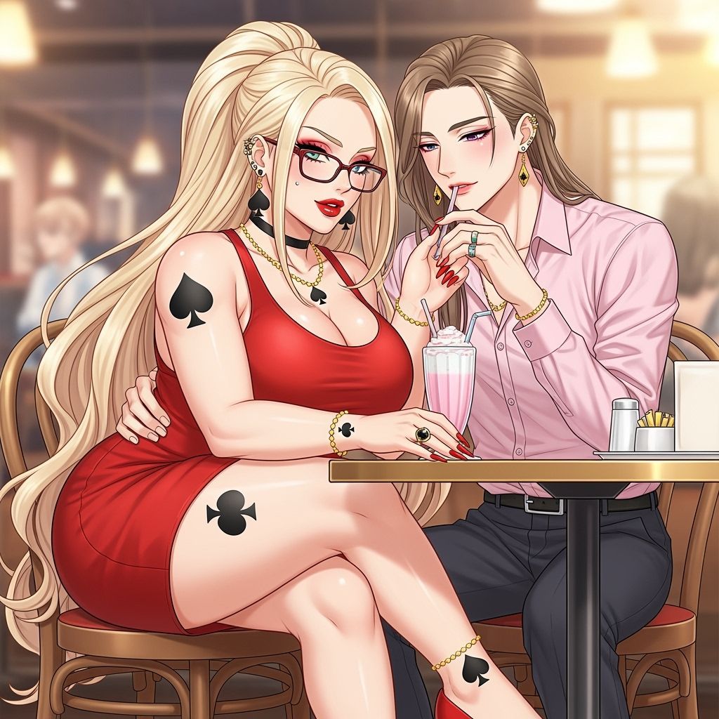 This anime-style illustration depicts a stylish couple sharing a milkshake at a cafe. The image features detailed characters with striking fashion and jewelry, rendered in a vibrant Japanese manga aesthetic.
