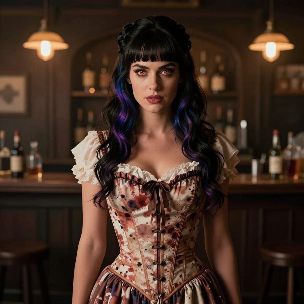 This cinematic film still captures a striking saloon woman with distinctive hair and copper eyes, adorned in a frilly corset dress. The image features an alcohol ink splatter aesthetic with dramatic lighting and film grain.