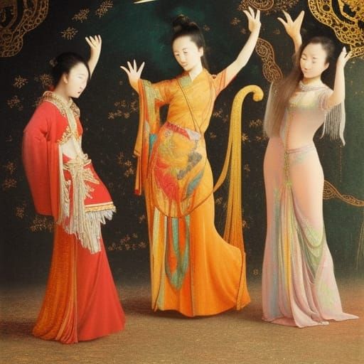 A fantastical oil painting of young Chinese women dancing on the moon. The scene features contrasting colors and sunshine rays in a liminal space reminiscent of Renaissance art.