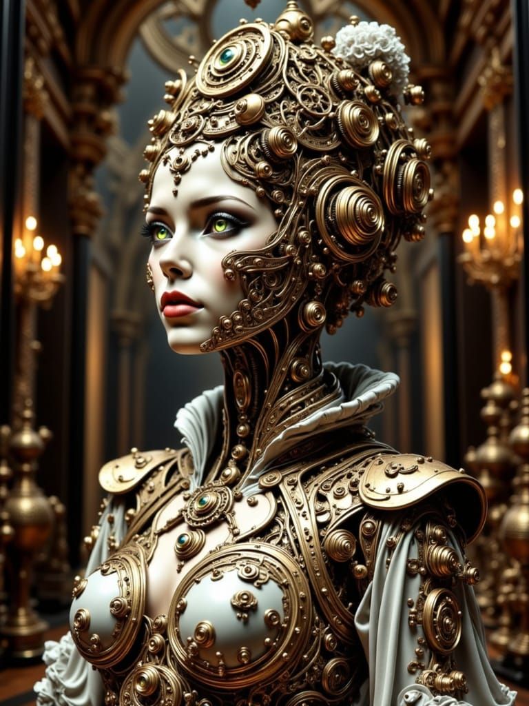 This image shows a hyperrealistic automaton of Tsarina Eudoxia Lopukhina, detailed with clockwork regalia and visible internal mechanisms. Rendered with dramatic lighting, it blends hyperrealism and surrealism.