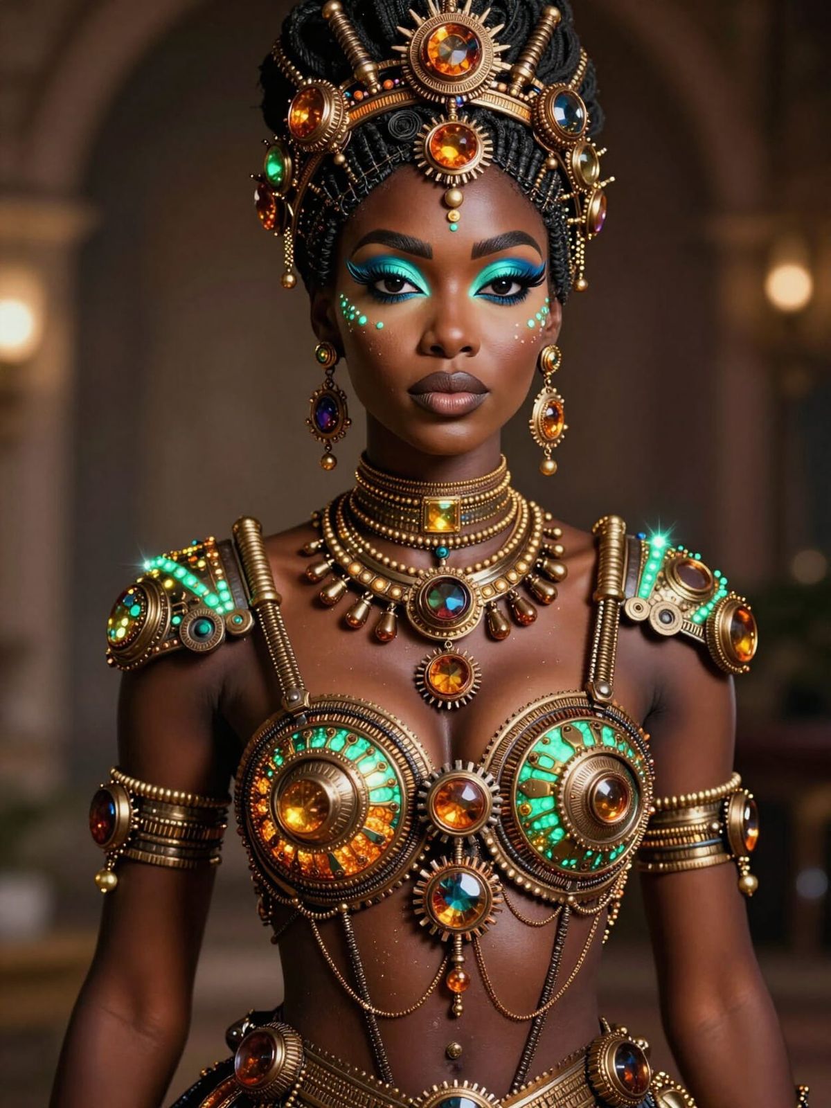 This image features a whimsical illustration of a princess with detailed Nubian skin and glowing steampunk accents. High contrast lighting and a shallow depth of field create a dynamic visual.