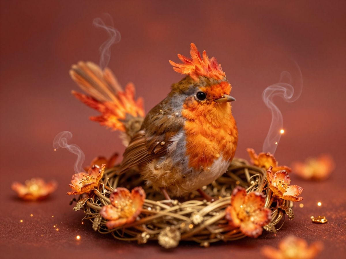 This image shows a tiny, fluffy baby phoenix emerging from a nest of molten gold and ember flowers, with soft crimson and orange hues in the background. The art style is gentle and warm.