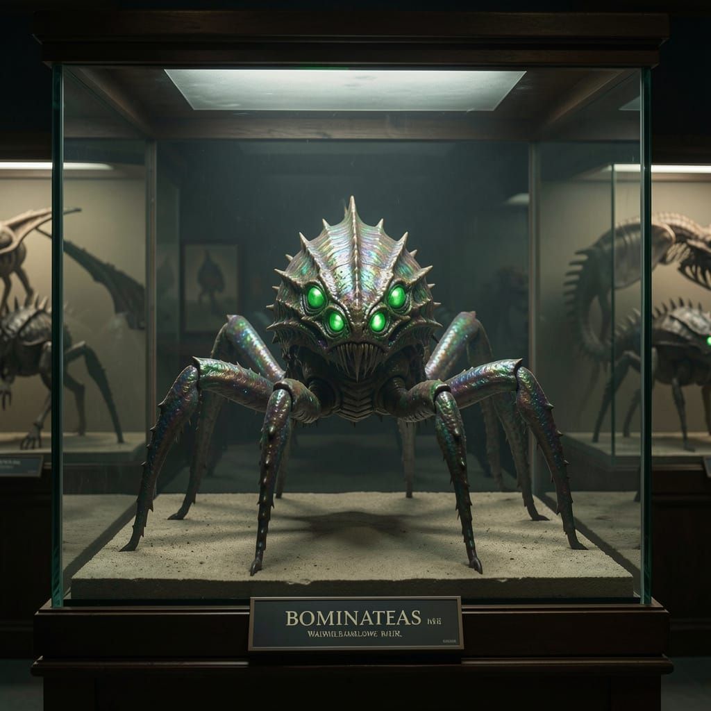This image shows a bizarre, six-legged creature with iridescent scales and glowing eyes, displayed like a specimen in a darkly fantastical museum exhibit with cinematic lighting.