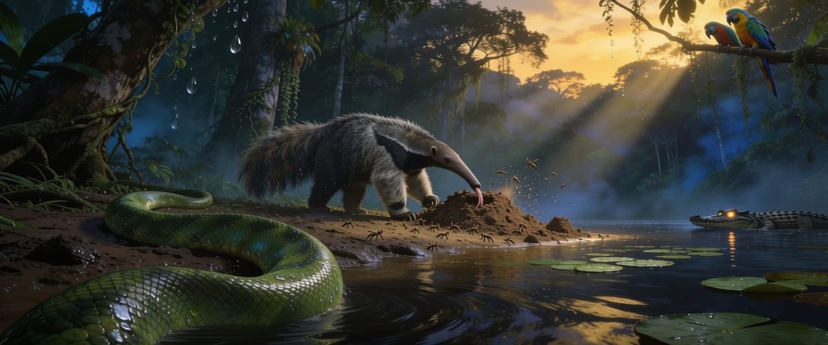 This image shows a cinematic view of the Amazon rainforest at dusk, with a green anaconda entering the river and a giant anteater on the bank. Hyper-realistic detail captures the rich biodiversity of the scene.