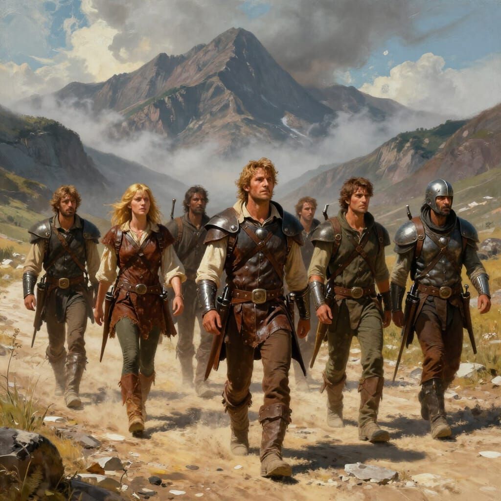 This image shows triumphant adventurers on a dusty road with misty mountains. Cinematic lighting and vibrant colors evoke epic adventure and peril in a painterly art style.