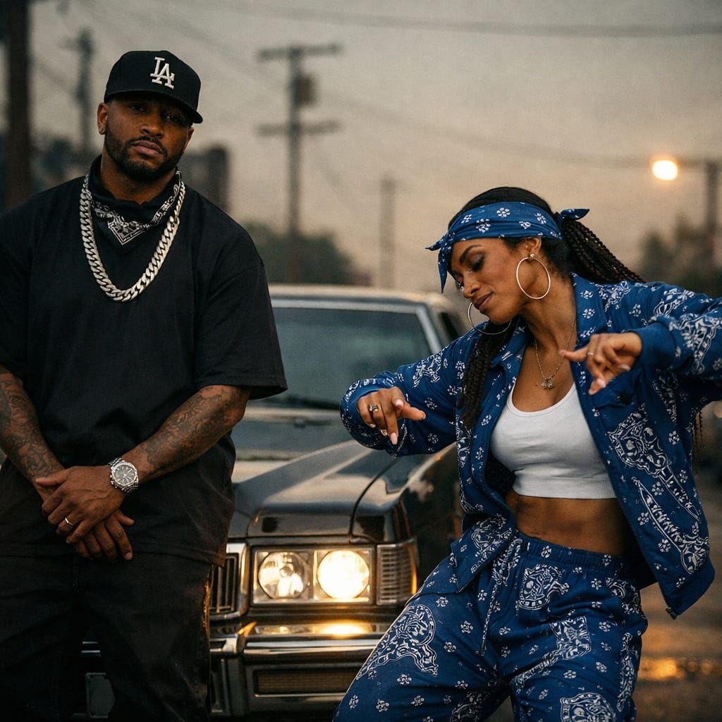 A realistic cinematic film still of a gangster man and woman near a Cadillac. Features dramatic lighting, film grain, and a vignette for an atmospheric, masterpiece quality.
