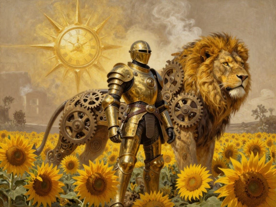 This image shows an inventor in brass armor beside a mechanical lion, set against a field of sunflowers. Rendered in sepia tones with intricate details, it evokes an oil painting style.