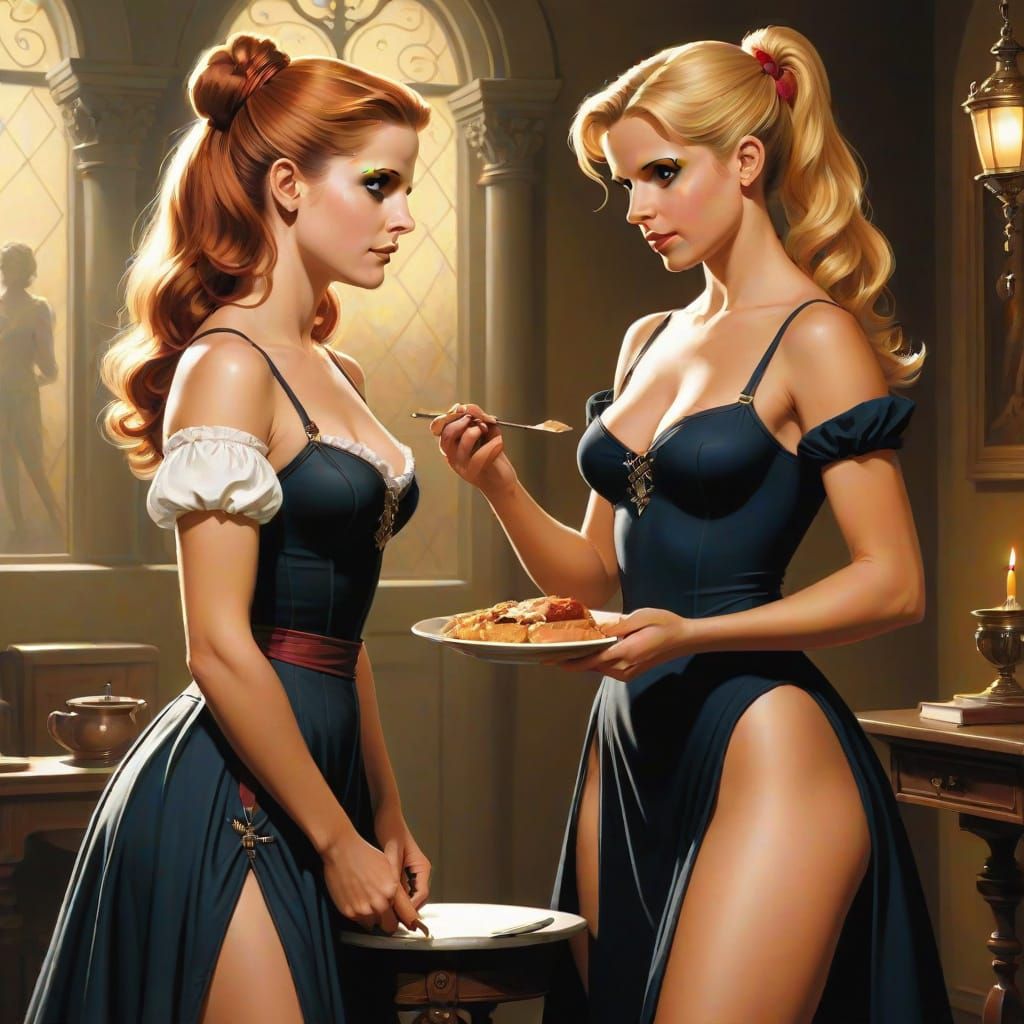 This image depicts a tender first meeting between two women, inspired by romantic artistic styles and aesthetics.