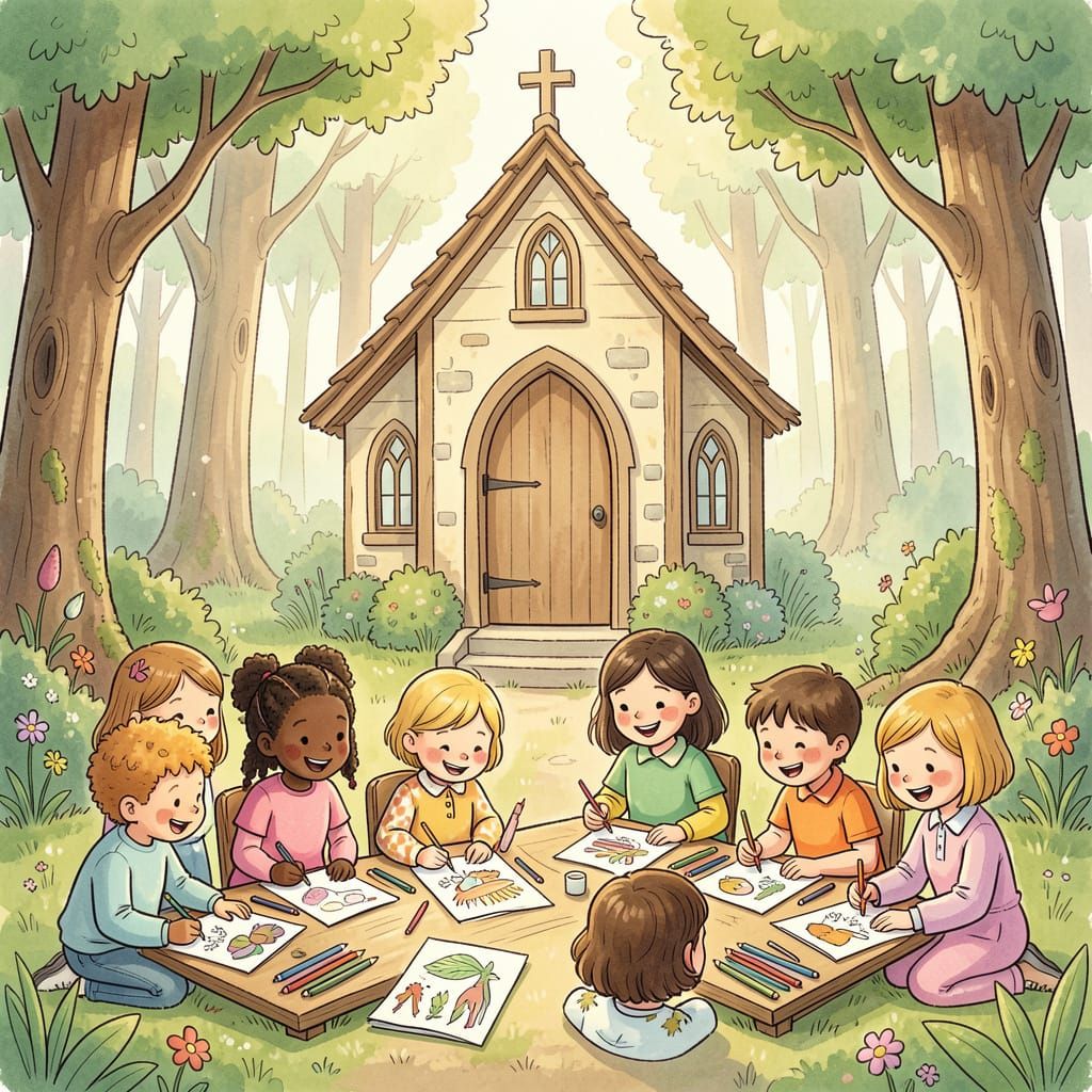 This image shows happy children coloring around a forest chapel, depicted in a charming children's book illustration style with soft colors and bold outlines.