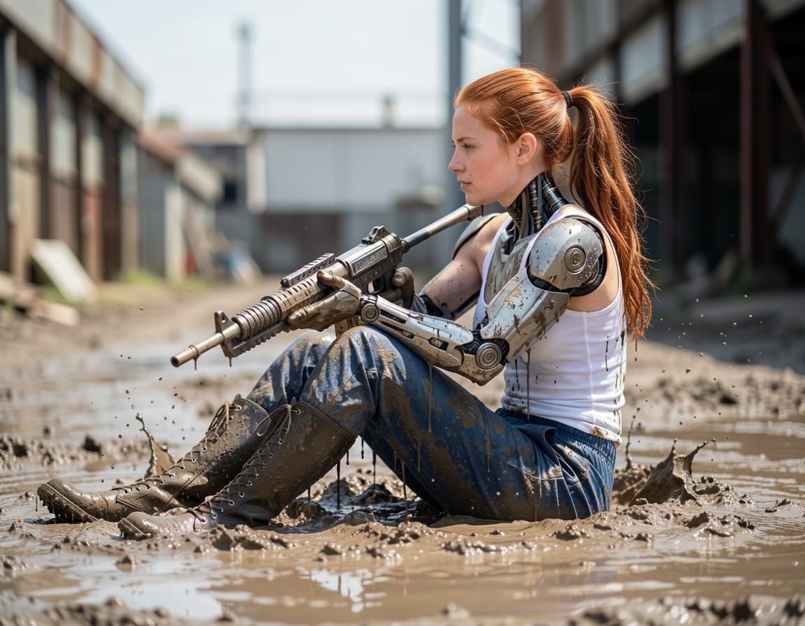 An ultra-realistic photo captures a cyborg woman with a human head and mixed cybernetic/human body struggling in deep mud. Set in a gritty industrial daylight scene, showcasing wet textures and mud splashes.