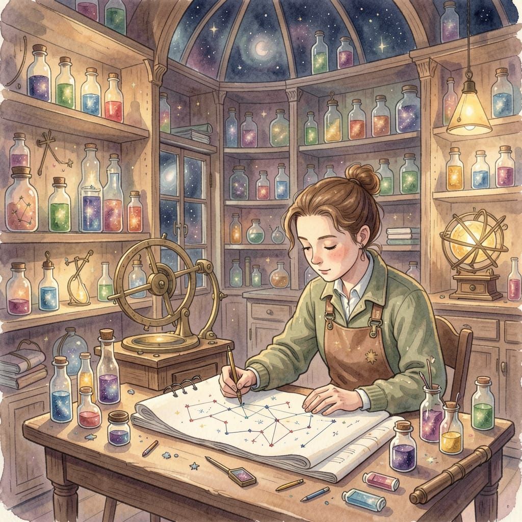 A whimsical watercolor illustration of a cosmic mapmaker in an observatory, using stardust and nebulae ink. Features astronomical tools and glowing bottled phenomena, evoking a sense of wonder.