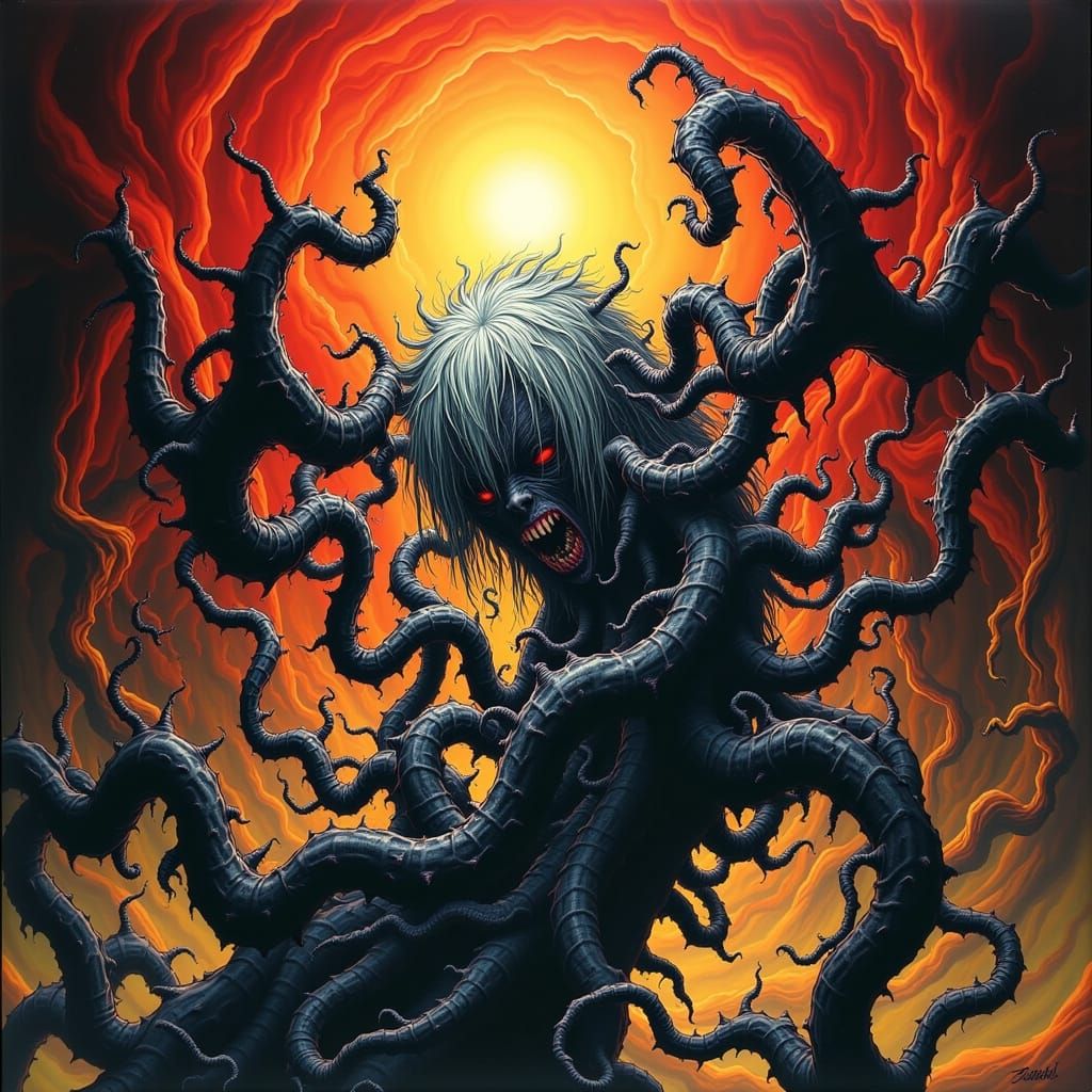 This image depicts a contorting figure with long, matted white hair and fiery eyes, rendered in a dark, abstract, and morbid surreal horror style.